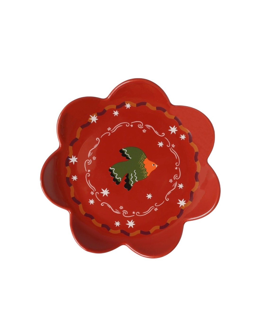 Petite assiette Rouge avec Oiseau - 12cm - All the Luck in the World : Avec sa forme fleurie et son adorable oiseau vert au centre, cette assiette rouge apporte une note chaleureuse et artisanale à vos repas ou à vos décorations de table.