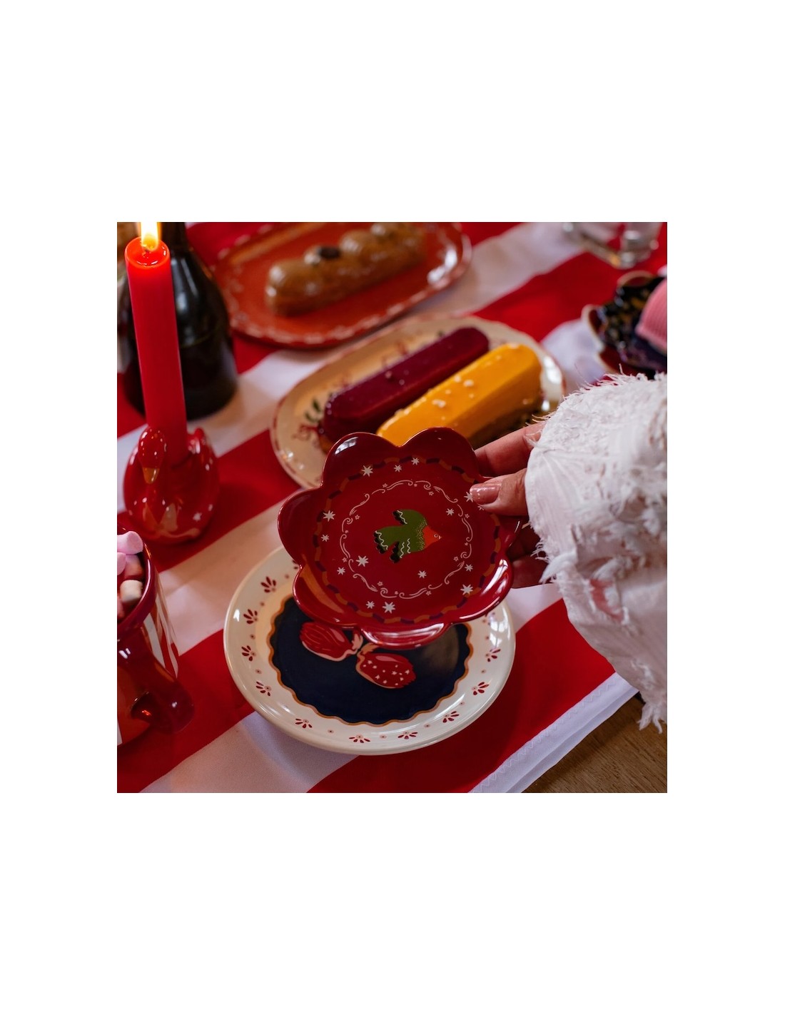 Apportez de la gaieté à vos moments gourmands avec cette charmante assiette rouge en forme de fleur. Son motif d’oiseau vert et orange, entouré d’étoiles et de volutes blanches, évoque la douceur des fêtes et la convivialité d’un repas partagé. Parfaite pour présenter vos desserts, biscuits, ou comme coupelle décorative, elle saura attirer tous les regards.