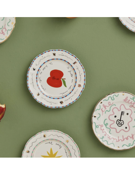 Assiette Chiave 16.5cm - : Assiette à dessert ornée d'une pomme rouge et d'une clé en son centre, en porcelaine et dorée à l'or fin.