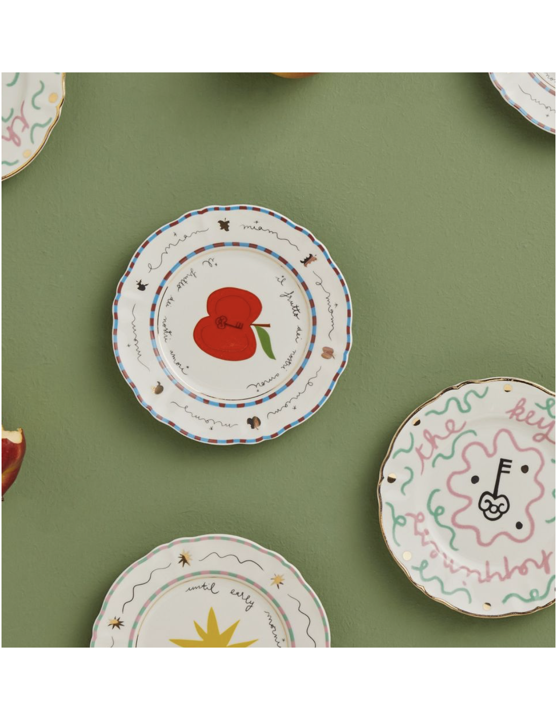 Assiette à dessert en porcelaine magnifique de la marque de design italienne Bitossi Home ornée d'une clé au centre, entourée de l'inscription "La clé du bonheur".