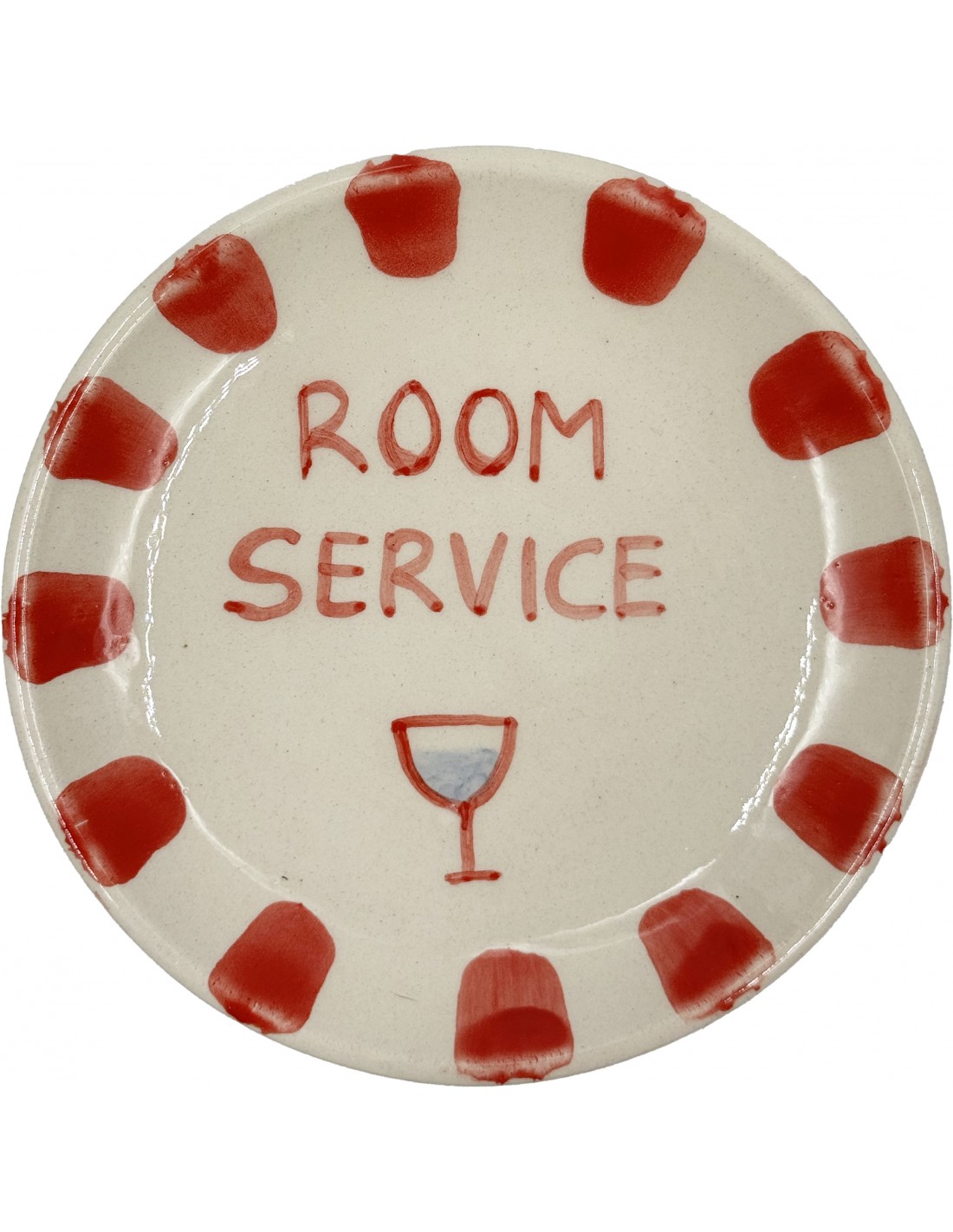 Assiette 13 cm - Room Serice : 🍴 Cette assiette de 13 cm de diamètre, décorée d’un verre à pied et de l'inscription "Room service", est idéale pour accueillir petites gourmandises ou servir de vide-poche décoratif.
