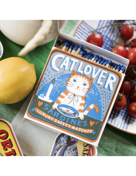 Allumettes Cat Lover Sardines by The Printed Peanut - The Archivist : Cette boîte d’allumettes signée The Printed Peanut est un véritable petit bijou illustré ! Avec son design ludique représentant un chat gourmand dégustant des sardines, elle apportera une touche d’originalité et de charme à votre intérieur.
