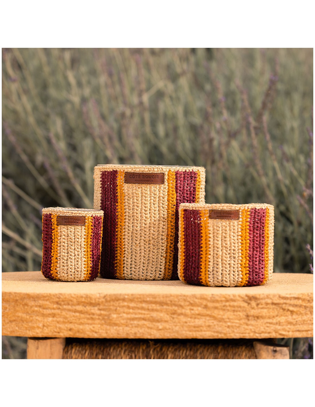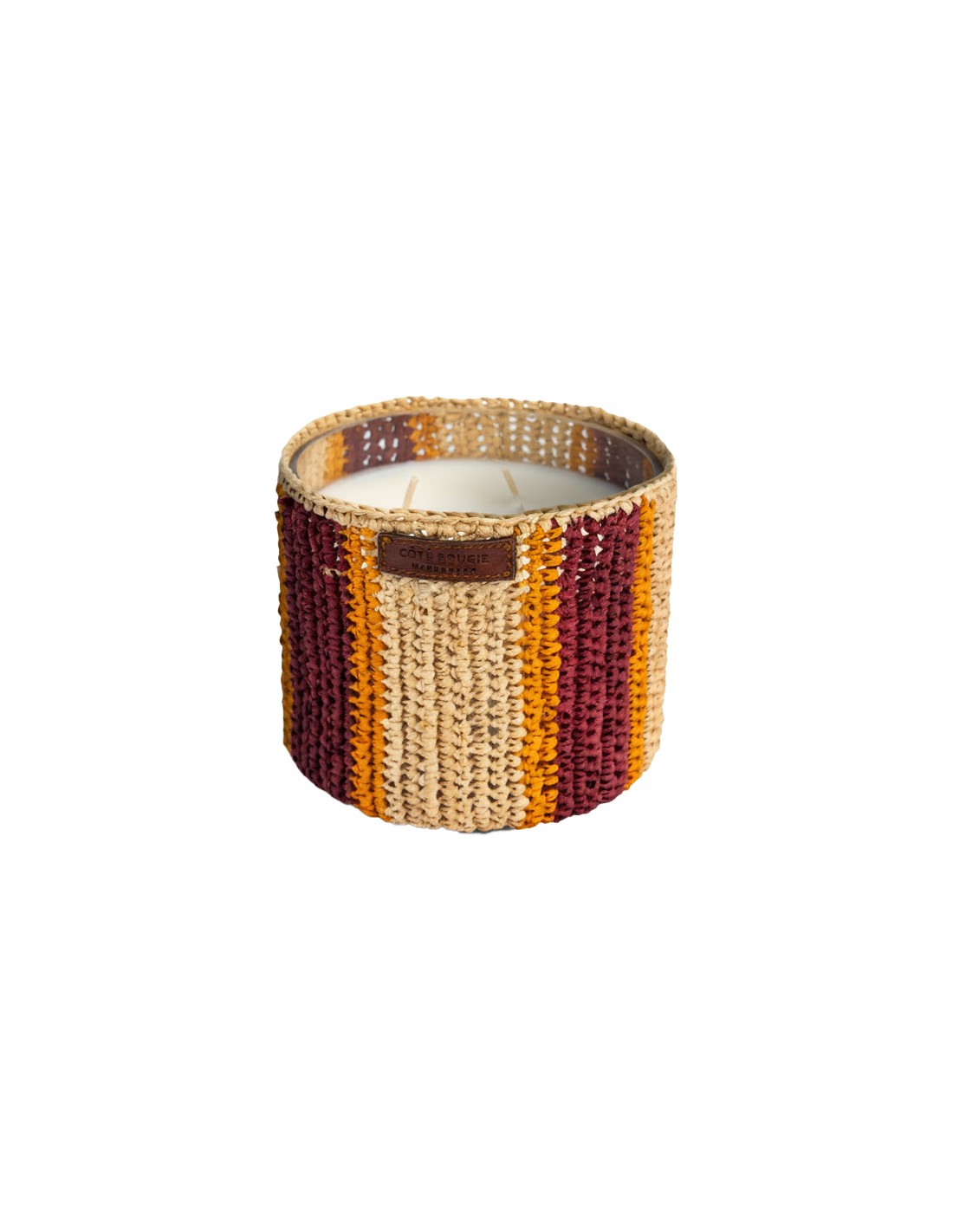 Bougie raphia Rim M - Dattes : Découvrez notre bougie parfumée à la Datte, une ode aux saveurs sucrées et chaleureuses de l'Orient. Présentée dans un pot en verre raffiné, recouvert d’un raphia coloré tissé à la main, cette bougie allie charme artisanal et élégance. Son parfum gourmand et enveloppant évoque les douces notes caramélisées de la date, créant une ambiance réconfortante et sophistiquée. Parfaite pour sublimer votre intérieur tout en apportant une touche décorative unique.