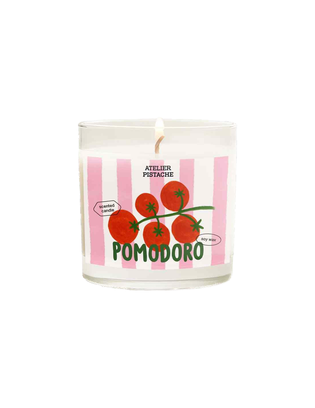 Bougie parfumée Pomodoro - Atelier Pistache : Une bougie parfumée fraîche et herbacée autour de la tomate mûre tout juste cueillie.