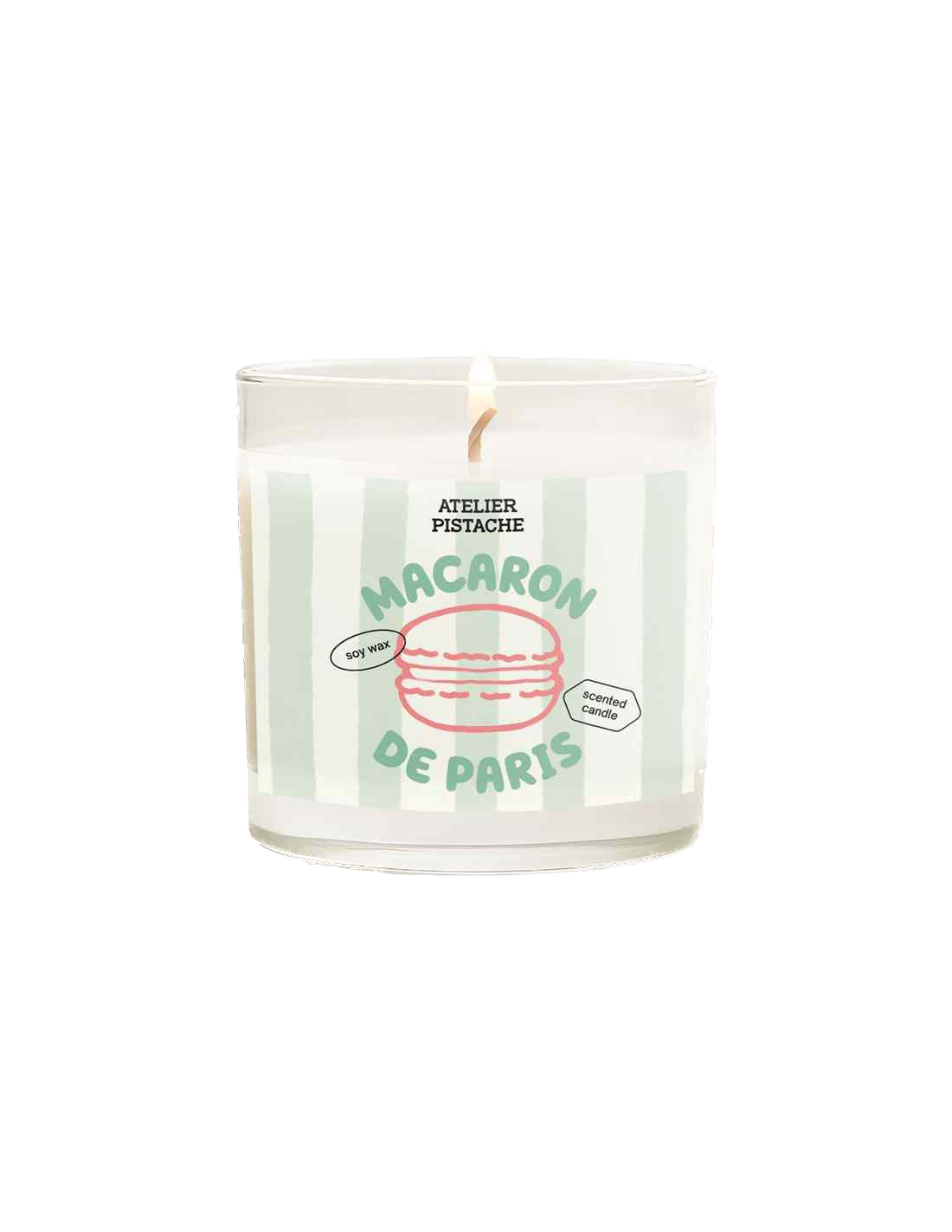 Bougie parfumée Atelier Pistache - Macaron : Une douceur délicate aux notes d'amande et de sucre, inspirée des pâtisseries parisiennes.