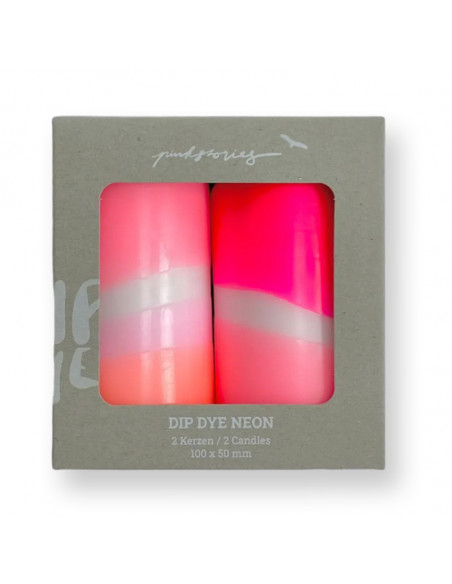 Set de 2 bougies piliers Dip Dye Neon - Flamingo Feathers : un coffret de 2 bougies piliers joliment colorées à la main. De belles couleurs qui ne bougent pas, les motifs varient légèrement entre chaque bougie ce qui les rend uniques et spéciales