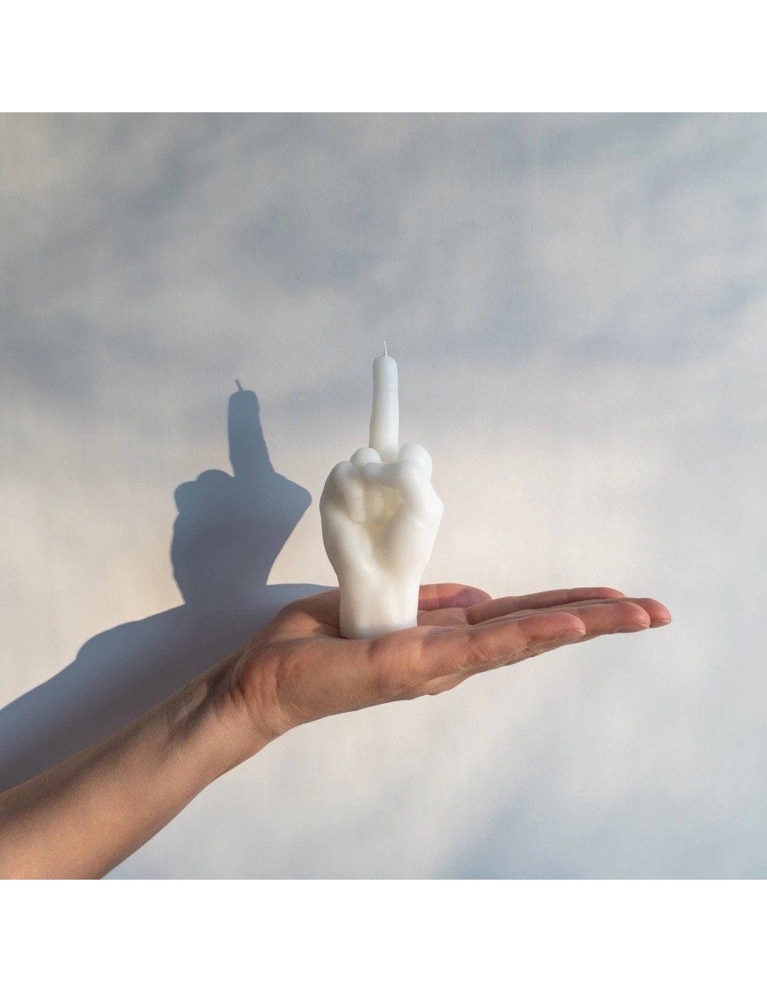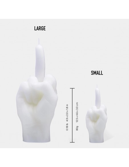 Cette bougie sculpturale reprend le doigt d’honneur dans un format mini de 12 cm, habillé d’un blanc lumineux et intemporel. Le contraste entre la pureté de la couleur et la force du geste en fait un objet décoratif à la fois audacieux et élégant.