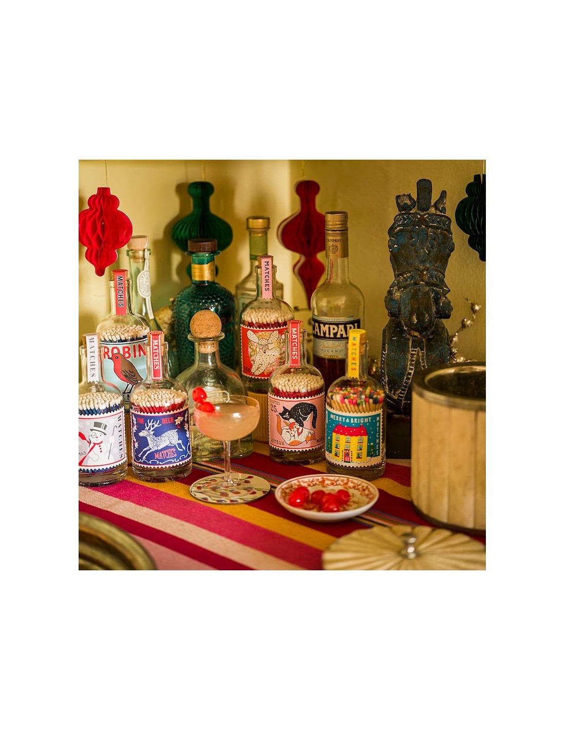 La bouteille "Season’s Greetings" apporte une touche joyeuse et chaleureuse à vos célébrations de fin d’année. Ornée d’une étiquette aux tons rouges et dorés, décorée d’un lapin festif, elle combine parfaitement esprit vintage et atmosphère de Noël. En verre avec bouchon en liège, elle renferme des allumettes en bois aux tiges rouges, prêtes à allumer vos bougies ou votre cheminée.