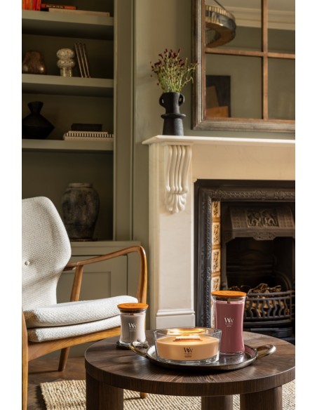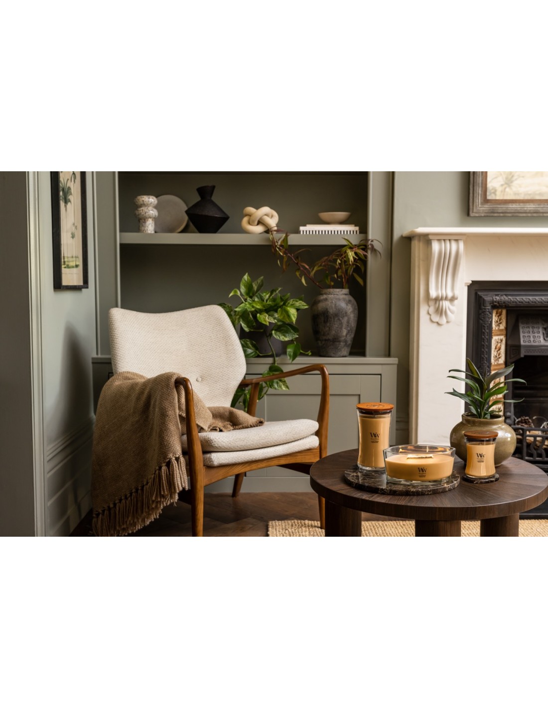 Bougie WoodWick Bourbon Doré - Ellipse : Laissez-vous envoûter par un parfum captivant où la douceur du miel ambré se mêle à la chaleur épicée du safran et du poivre noir. Cette harmonie gourmande glisse sur des bois fumés, enveloppant les sens d'une chaleur irrésistible et d'une sensualité profonde. Une expérience olfactive audacieuse et réconfortante, parfaite pour ceux qui recherchent une signature chaude, intense et envoûtante.