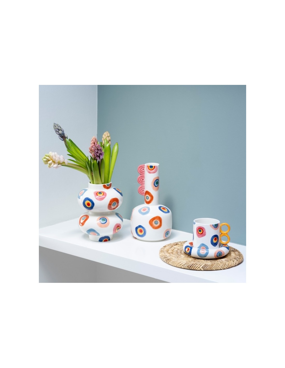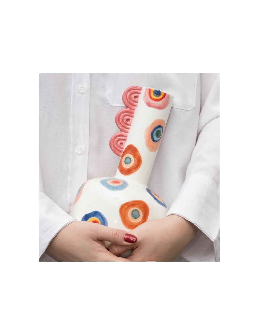 Vase Lucas - Ojos Vivos : Ce vase polyvalent combine esthétisme et fonctionnalité. Idéal pour embellir votre intérieur, il peut également se transformer en rafraîchisseur élégant, accueillant vos bouteilles de vin pour un apéritif chic. Sa palette de couleurs joyeuses et son design original en font une pièce unique, parfaite pour ajouter une touche de fraîcheur et de convivialité à vos réceptions.