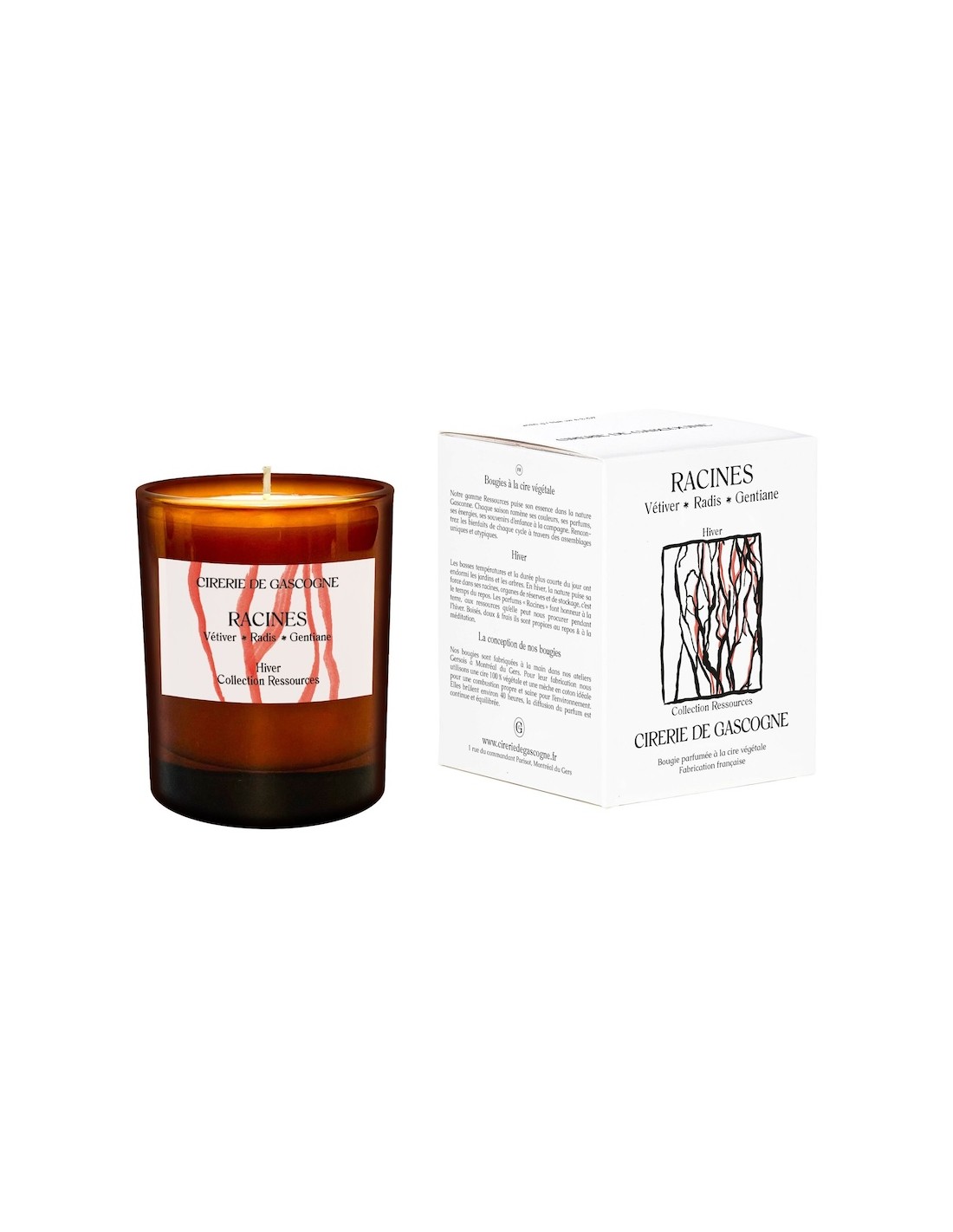 Vétiver, Radis, Gentiane - Cirerie de Gascogne : Les basses températures et les jours plus courts plongent jardins et arbres dans un profond sommeil. En hiver, la nature puise sa force dans ses racines, véritables réserves de vie et d’énergie, marquant ainsi le temps du repos. Le parfum "RACINES" rend hommage à la terre et aux ressources qu'elle nous offre durant cette saison. Avec ses notes boisées, douces et fraîches, il invite au calme, à la méditation et à la détente