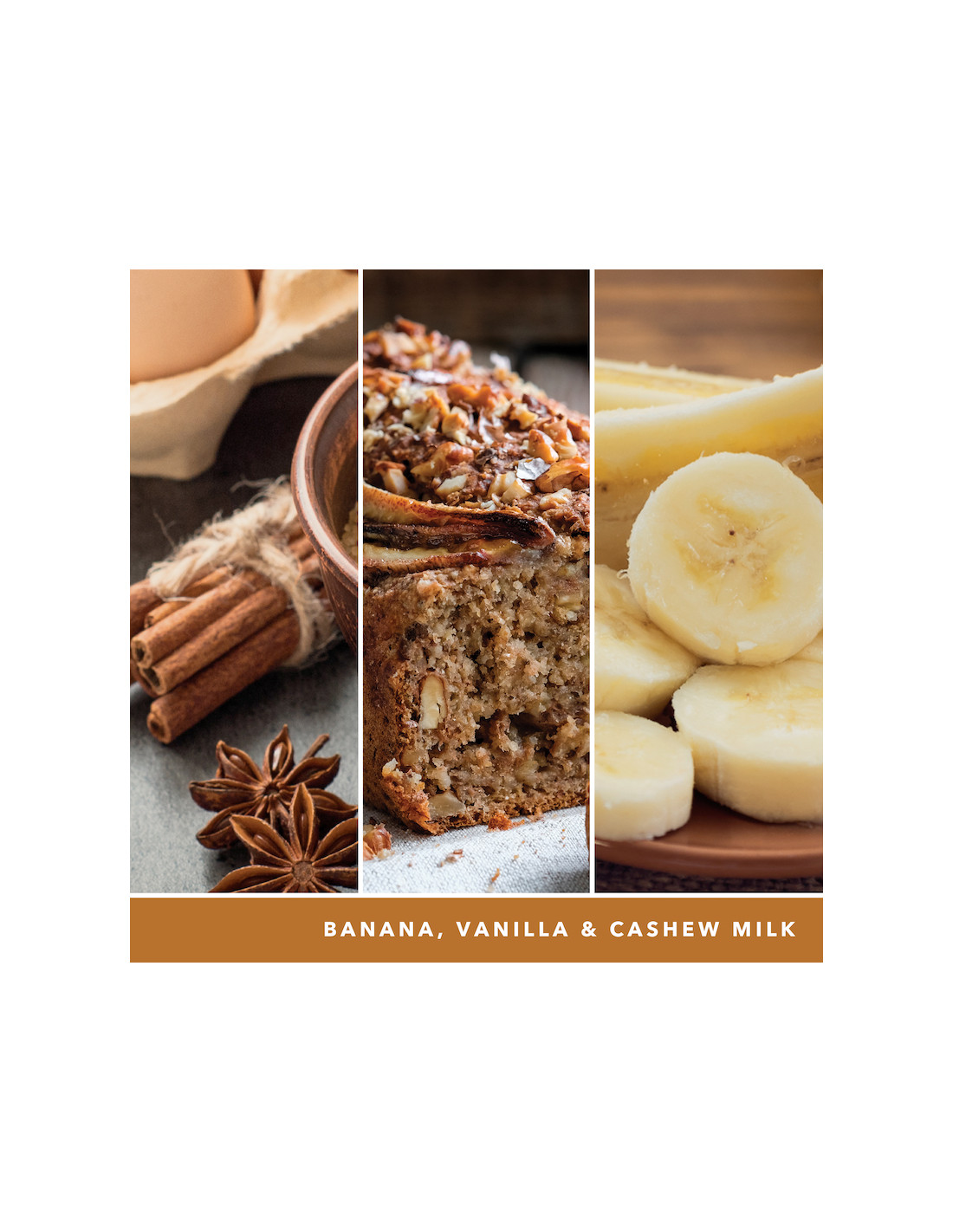 Notes de coeur : Noix de muscade, banane, citrouille cuite, crème au beurre, lait de noix de cajou