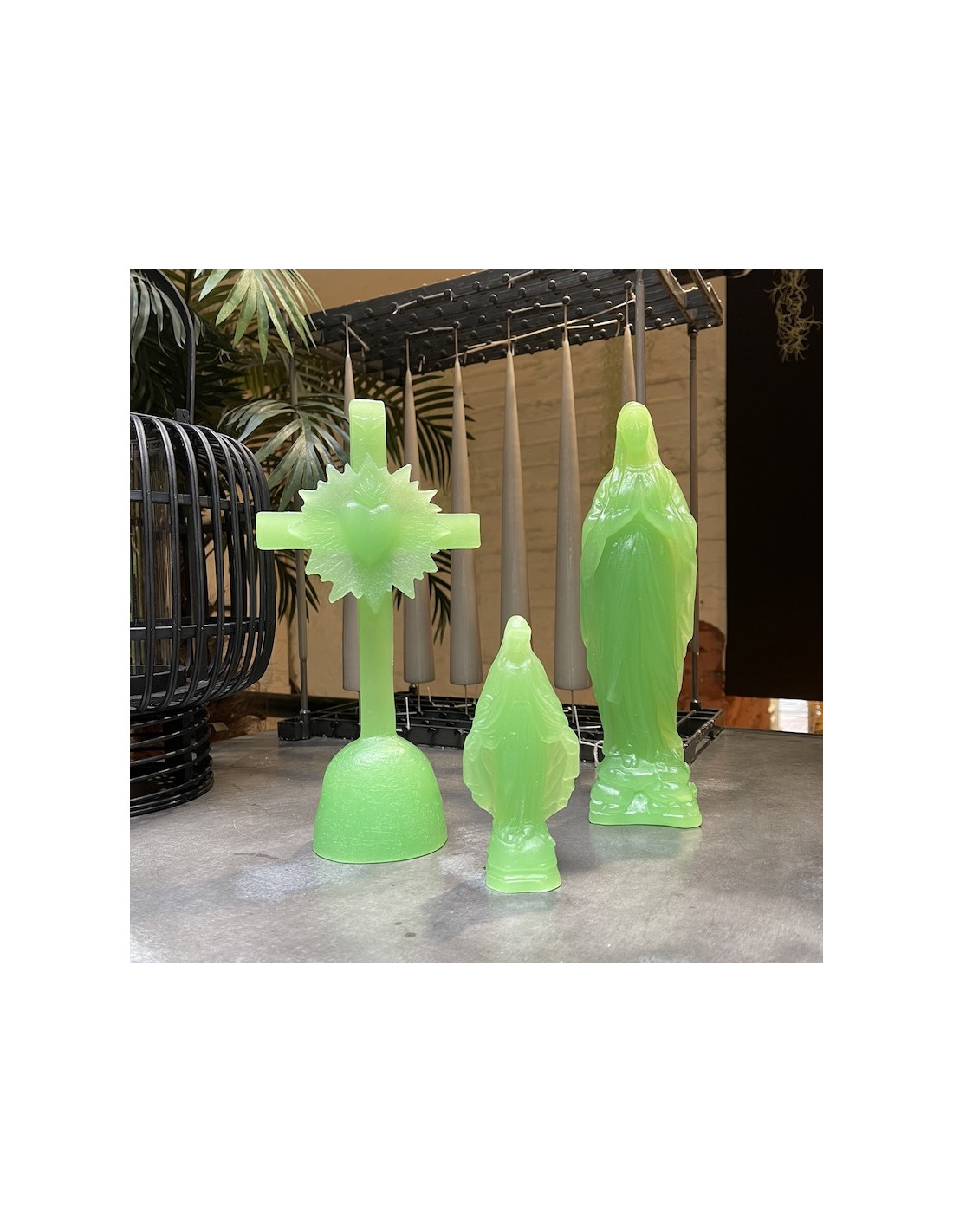 Vierge Miraculeuse de couleur menthe 15 cm fabriquée artisanalement en France par la Ciergerie des Premontrés, dernière ciergerie manuelle de France et entreprise.