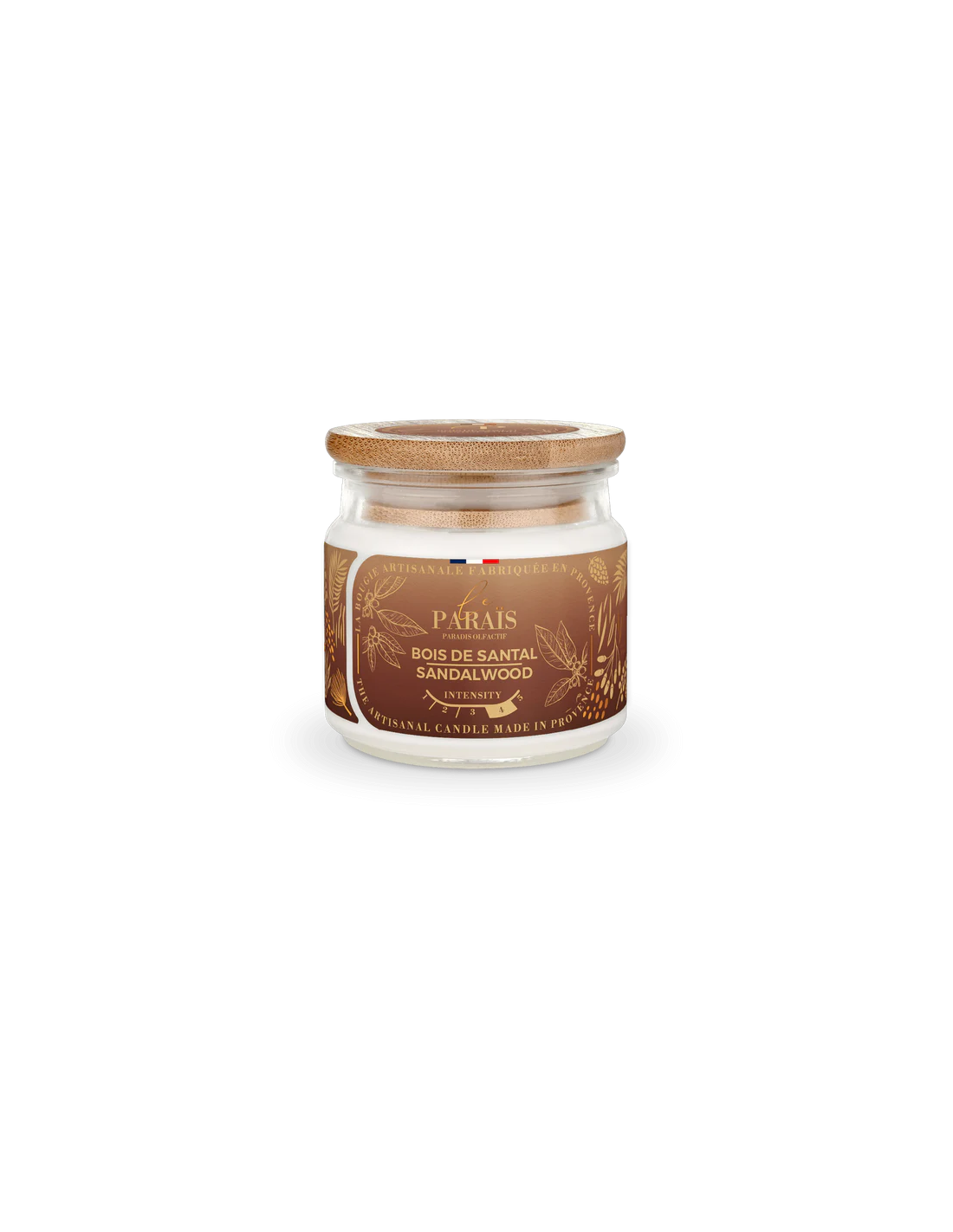 Bougie Santal 150ml - Le Paraïs: Une subtile harmonie de notes boisées et élégantes pour une ambiance raffinée et enveloppante. Célèbre pour son caractère sensuel et son intensité, la fragrance Santal saura magnifier votre intérieur par son allure mystérieusement masculine.