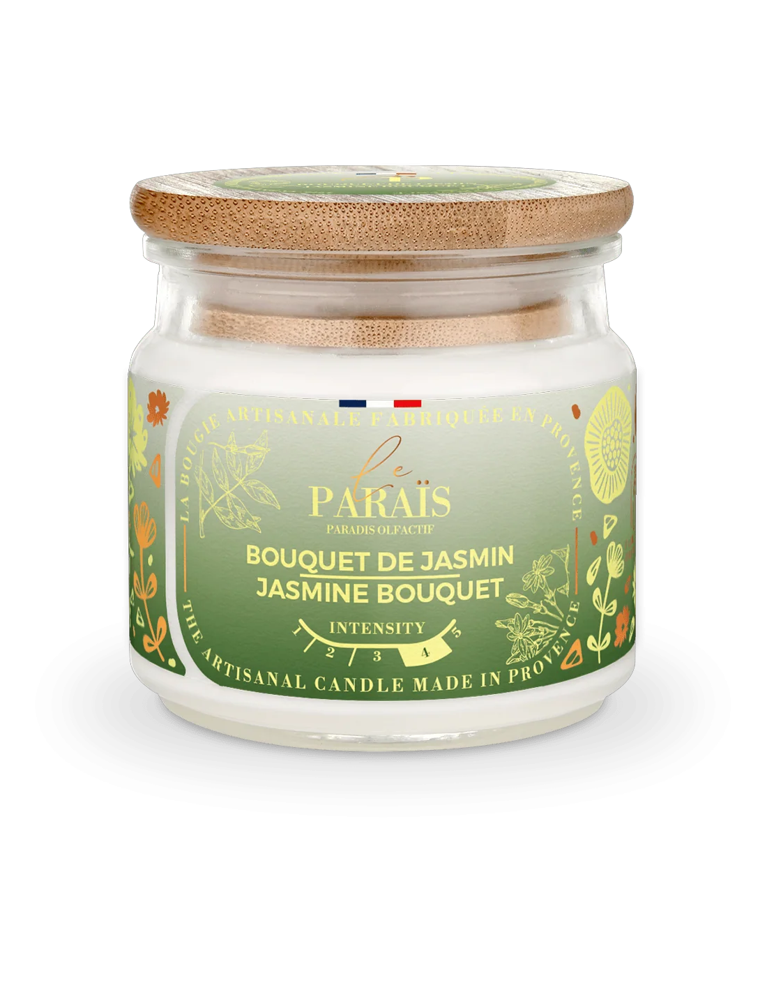 Bougie Bouquet de jasmin 150ml - Le Paraïs : Un parfum floral envoûtant et intensément captivant, laissez-vous transporter au cœur d'une plantation de jasmin.