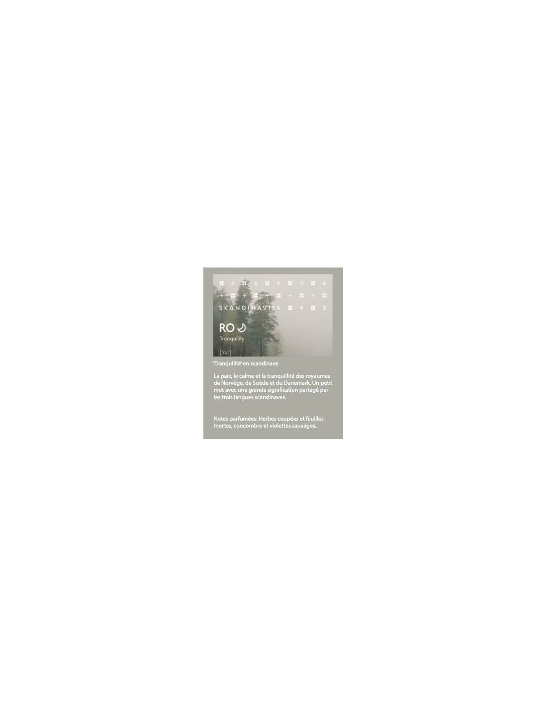 Le parfum Ro s'inspire de la tranquillité des royaumes de Norvège, de Suède et du Danemark. Ro, partage la même signification de calme et d'apaisement dans les trois langues scandinaves. C'est un accord vert et léger autour de l'herbe coupée, des feuilles mortes et du concombre, auquel vient s'ajouter une note florale féminine de violette sauvage.