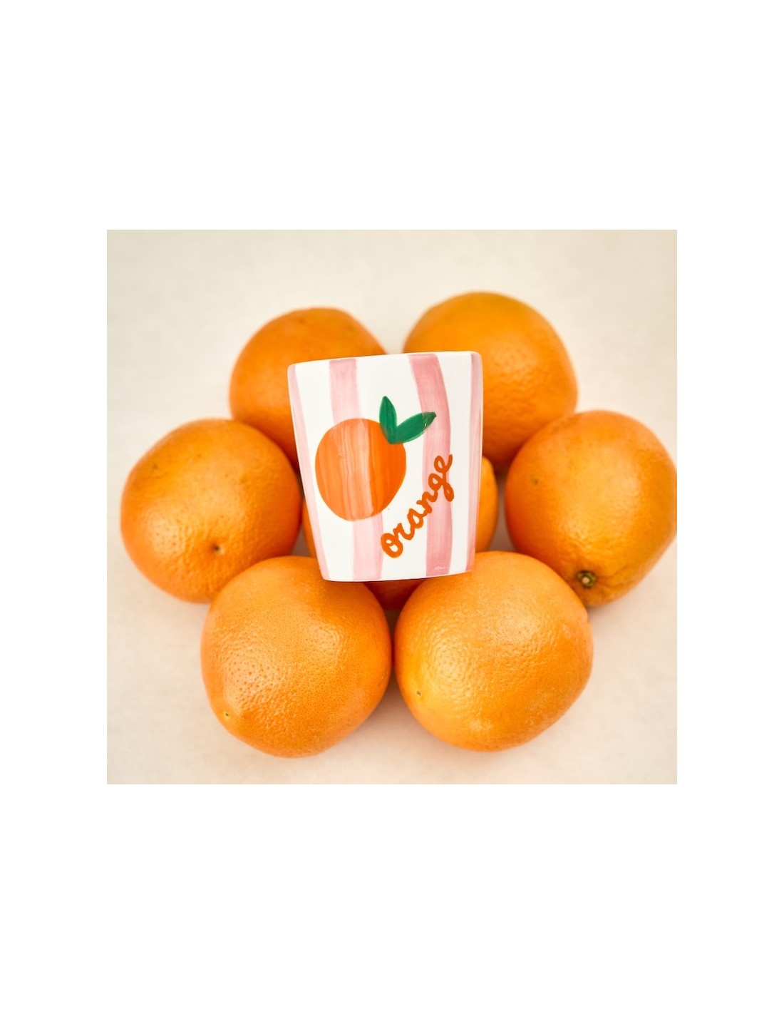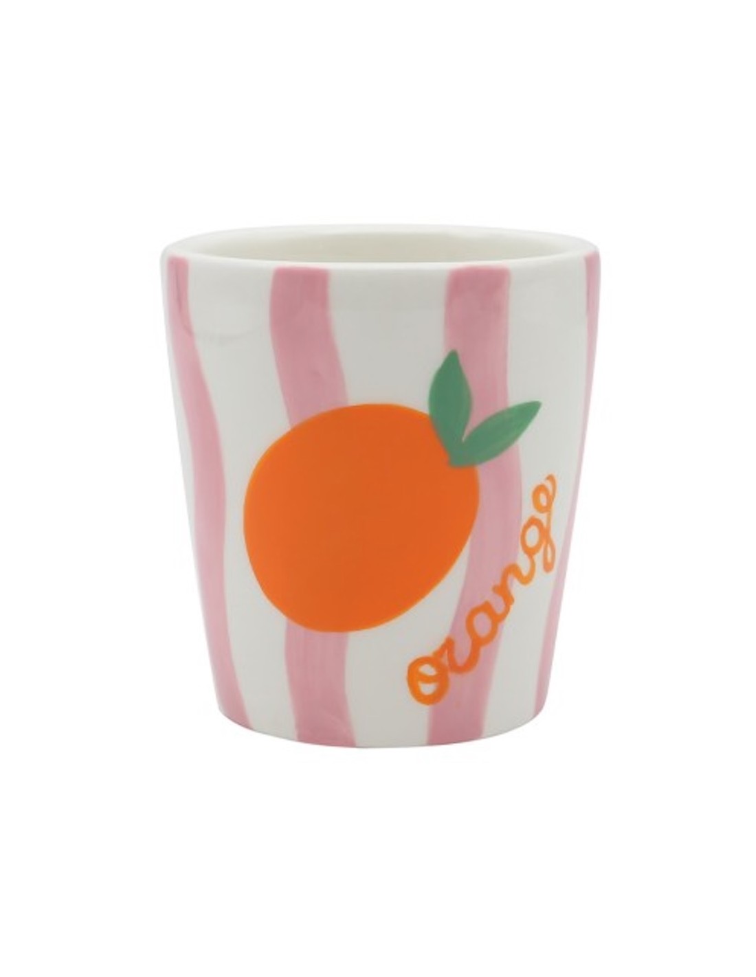 Mug Valentina Fruit - Orange : Mug en céramique aux rayures rose et blanc, décoré d’une orange et de l’inscription « Orange ». Un mug lumineux et vitaminé, parfait pour égayer vos pauses café ou thé.