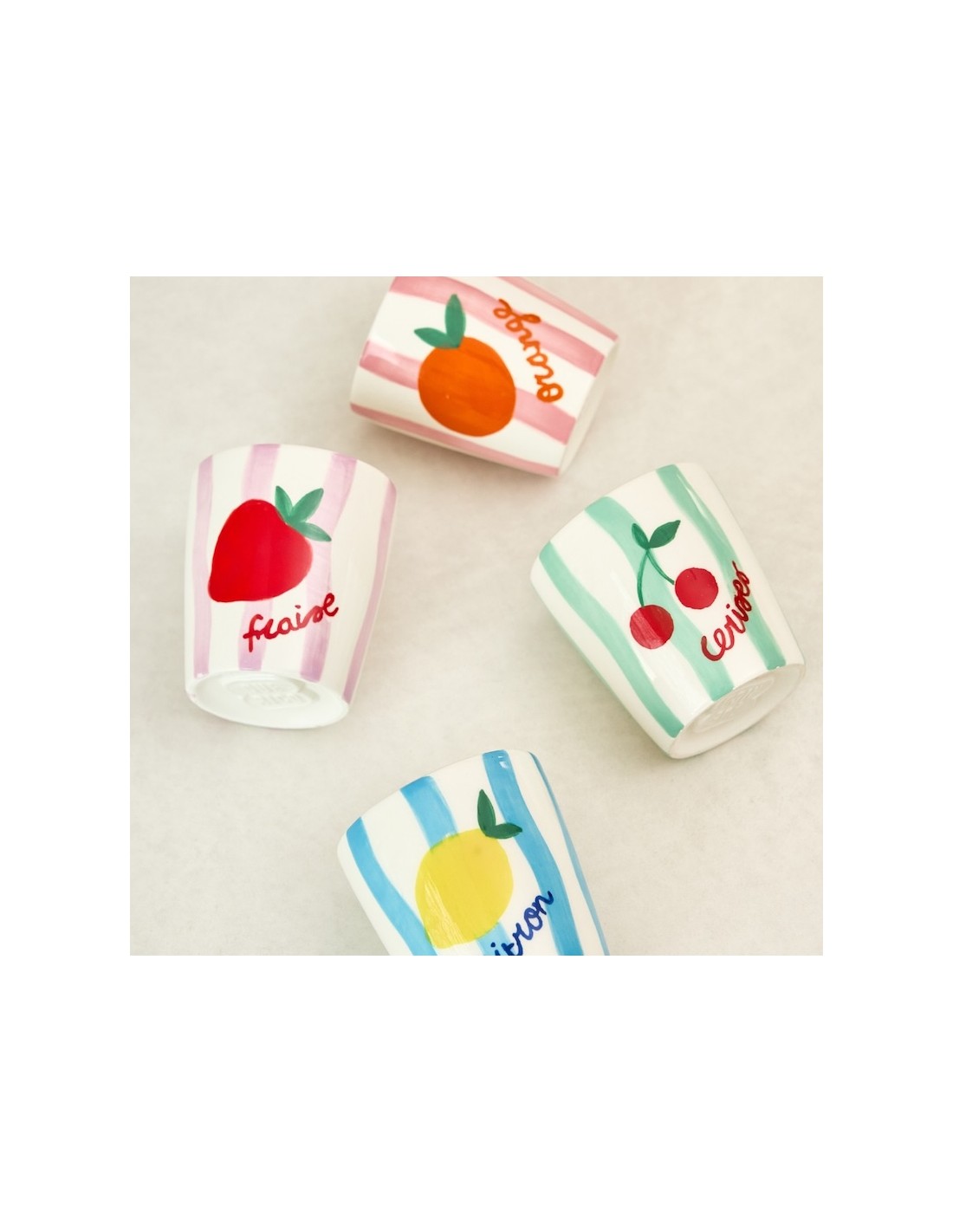 Ce mug en céramique séduit par son design frais et solaire, associant de douces rayures rose poudré à un motif orange vif accompagné de feuilles vertes. L’inscription manuscrite « Orange » apporte une touche ludique et graphique, idéale pour commencer la journée de bonne humeur.