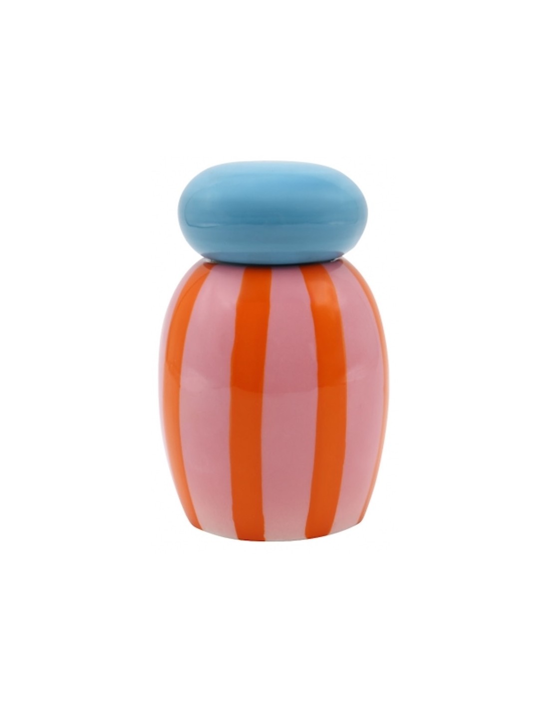 Bocal Simona - Rayures Orange : 🍬 Une explosion de couleurs et de bonne humeur ! Ce petit bocal rayé orange et rose, surmonté d’un couvercle bleu ciel, allie style rétro et esprit pop.