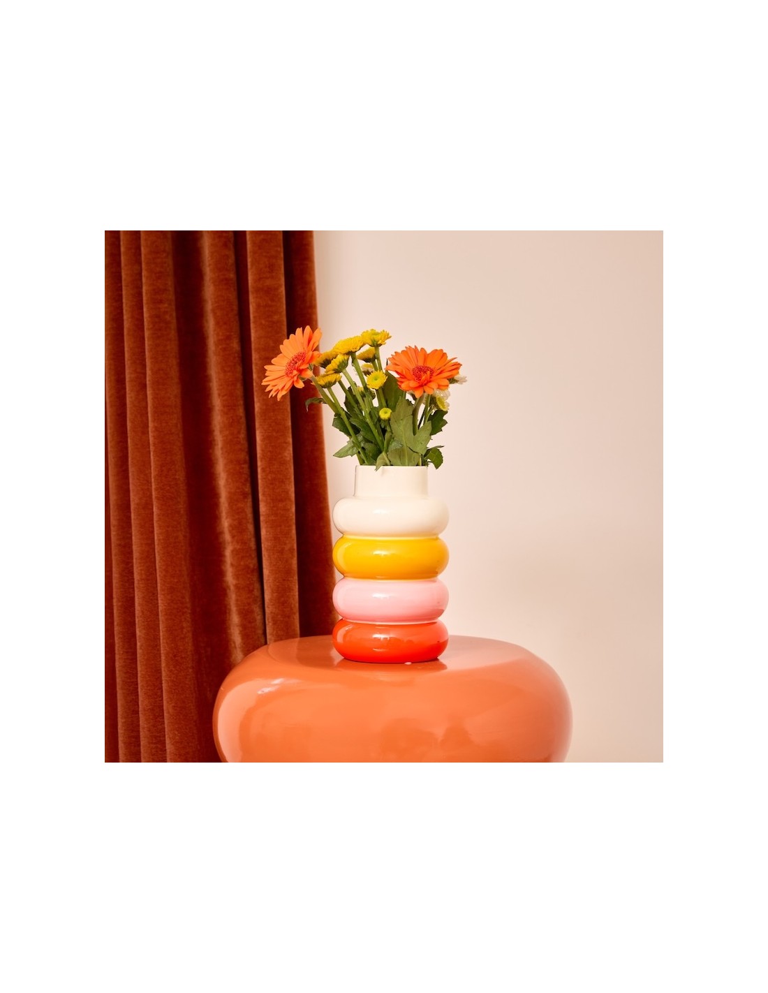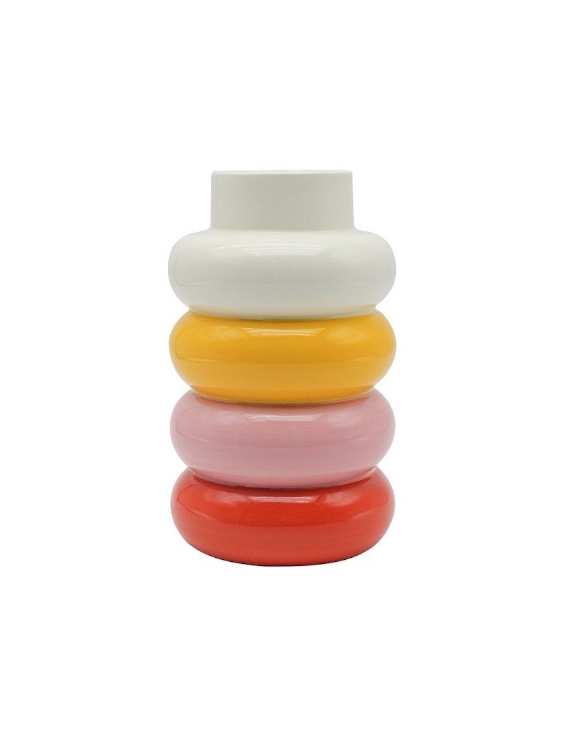 Ce vase en céramique se distingue par son design architectural et graphique, composé de volumes arrondis empilés qui créent une silhouette à la fois ludique et élégante. Ses teintes harmonieuses – blanc, jaune, rose et rouge – apportent douceur et dynamisme à votre intérieur.